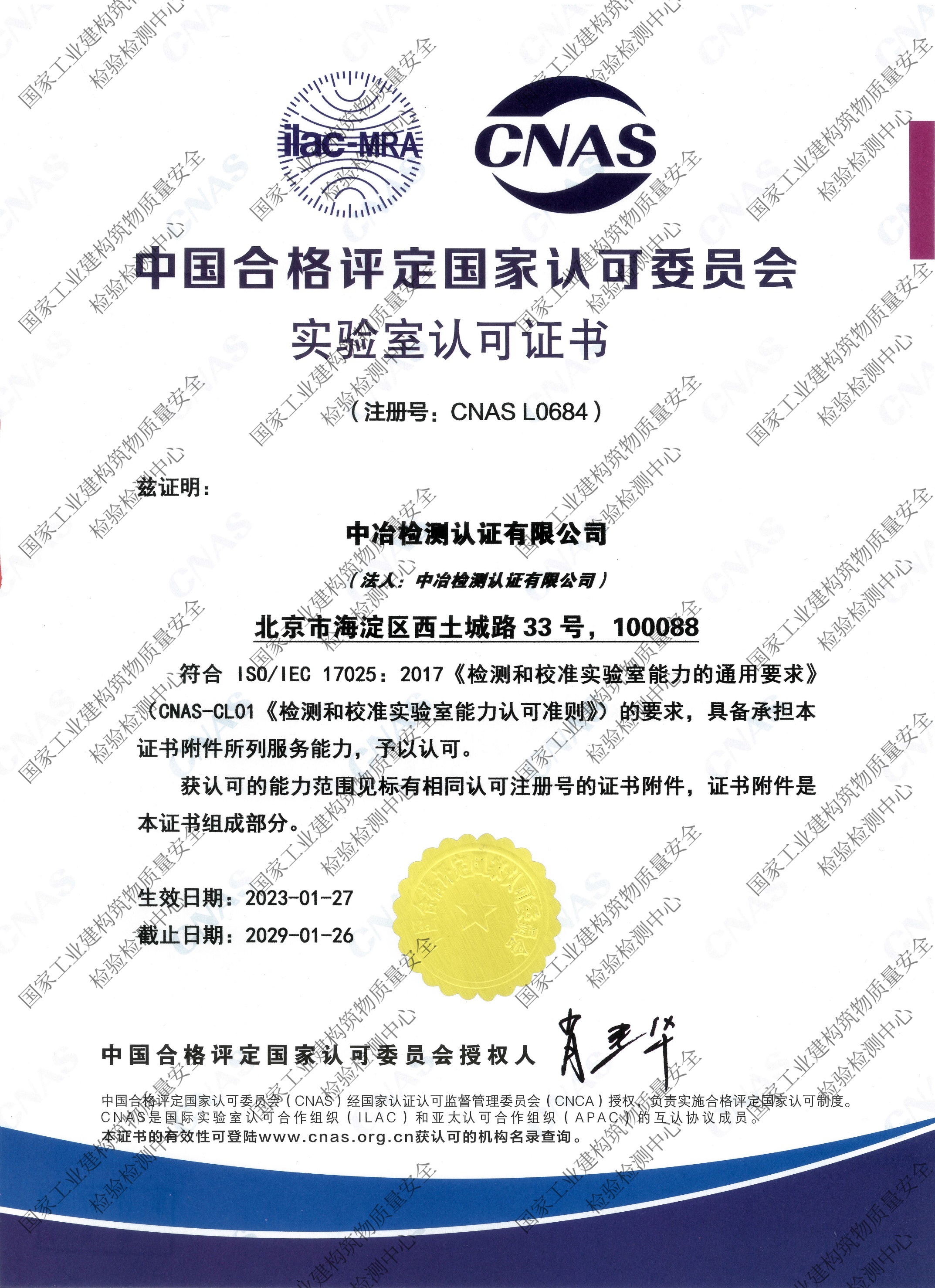 中国合格评定国家认可委员会颁发的实验室认可证书(CNAS)